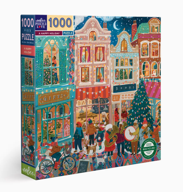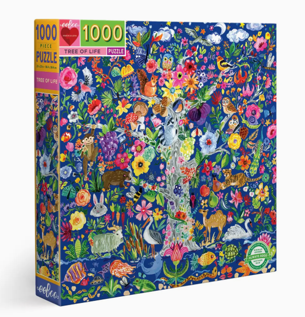 1000 sturdy, dustless pieces. Completed puzzle: 23” x 23”  includes full-color insert for reference. Curated Artist’s Playlist via QR code on box. Made with recycled board and printed on FSC®-certified paper using vegetable-based inks.