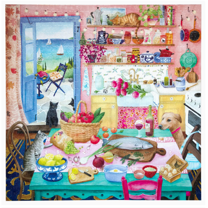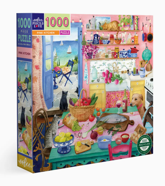 Pink Kitchen: Artist Maria Over meticulously and lovingly renders the Pink Kitchen. Another beautiful and quirky space for Piece and Love's popular series of "Kitchen" puzzles. Enjoy the calm, the animals, flowers, fruits, and summer sea breeze.